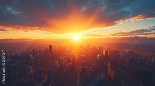 Stunning Sunset Over City Skyline, A breathtaking sunset over a city skyline, with tall buildings silhouetted against vibrant orange and yellow hues