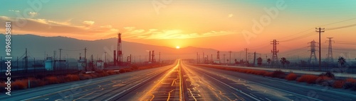 sunset, highway, road, empty, power, line, mountain, distance, serene, beauty, evening, landscape, sky, horizon, travel, scenic, nature, tranquil, dusk, twilight, orange, yellow, glow, peaceful, outdoors, journey, adventure, transportation, infrastructure, countryside, panorama, vista, calm, quiet, solitude, wilderness, remote, rural, picturesque, idylli, powerline