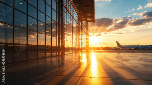stunning sunset reflects off glass facade of modern airport terminal, creating warm glow on polished floor