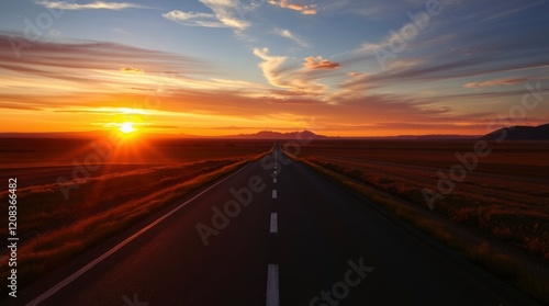 sunset, road, landscape, photo, travel, adventure, highway, sky, horizon, nature, scenic, view, beautiful, colours, gold, orange, red, cloud, huge, open, journey, destination, explore, image, picture, photo, wallpaper, background, desktop, screen, print, art, buy, download, purchase, stock, royalty, free, premium