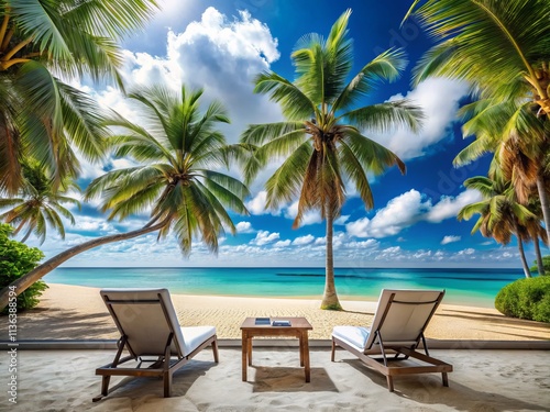 Stunning Tropical Beach Banner with White Sand, Coco Palm Trees, and Couple Chairs for Travel Tourism Concept - Luxury Island Resort Holiday Landscape Panorama