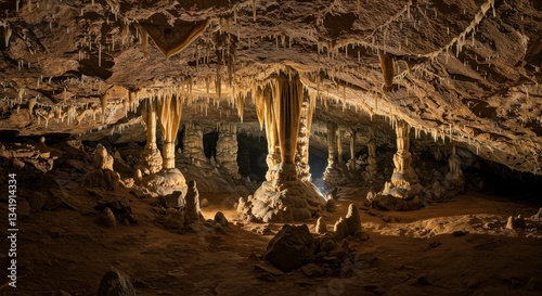 Stunning underground cave with stalactites and stalagmites, illuminated