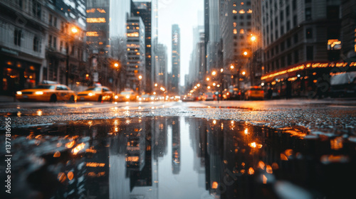 stunning urban landscape featuring towering skyscrapers, wet streets reflecting city lights, and yellow taxis navigating through bustling city. atmosphere is vibrant and dynamic