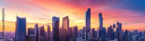 Stunning Urban Skyline at Sunset with Vibrant Colors and Modern Skyscrapers