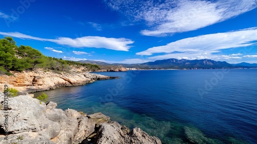 Stunning view of a tranquil coastline with clear blue water and bright sky inviting relaxation and peace : Generative AI