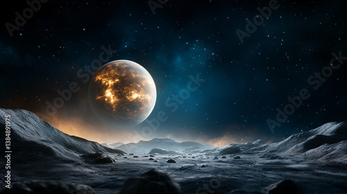 celestial bodies, night sky, fiery, exploration, wonder, extraterrestrial, cosmic, astronomy, space, terrain, star, lunar, surface, atmosphere, alien, geology, horizon, light, shadow, adventure, mystery, immensity, solitude, beauty, science fiction, surreal, landscape, planet, moon, universe, celestial, dark, illumination, scenery, starry sky, planetary, atmospheric, night, imagination, visual