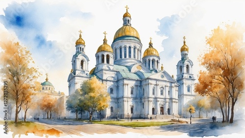 Stunning watercolor painting of Cathedral with golden domes, surrounded by autumn trees and a bright sky