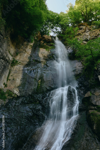 Stunning waterfall cascades down rocky cliffs surrounded by lush green forest and vibrant foliage, creating a refreshing and serene natural scene in daylight.