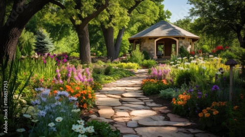 Stunning Wildflower Garden and Pathway Leading to a Rustic Gazebo Perfect for Landscaping and Gardening Enthusiasts