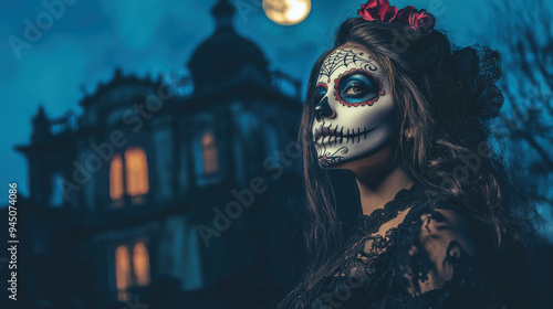 Stunning woman with sugar skull makeup, standing in front of a dark, haunted Mexican