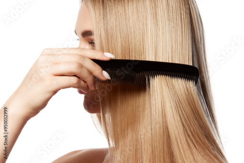 Stunning young woman with flawless blonde hair, brushing straight hair isolated on white background. Effective hair care and cosmetics. Natural beauty, hair care, health and beauty treatment concept