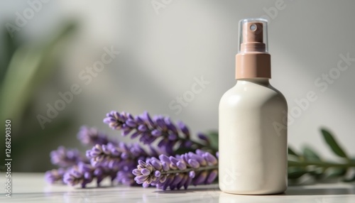 Stylish air freshener spray mockup, matte ceramic spray bottle with embossed branding, positioned beside fresh lavender, soft natural lighting with realistic textures