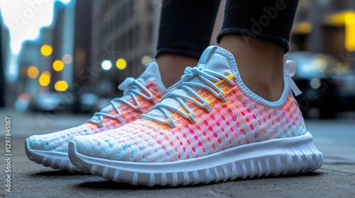 sneaker, shoe, footwear, running, athletic, urban, city, street, fashion, style, comfortable, trendy, colourful, knit up, knitted, texture, design, apparel, clothing, activewear, lifestyle, casual attire, walking, training, fitness, activewear, summer, spring, vibrant, bright, pastel, white, pink, orange, yellow, blue, many-coloured, lightweight, sole