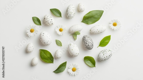 egg, spring, flower, daisy, leaf, nature, decor, elegant, white, speckled, minimalist, composition, fresh, celebration, easter, design, background, texture, green, natural, isolated, floral, art, stylish, festive, harmony, creativity, peaceful, seasonal, charming, soft, environment, arrangement, vintage, delicate