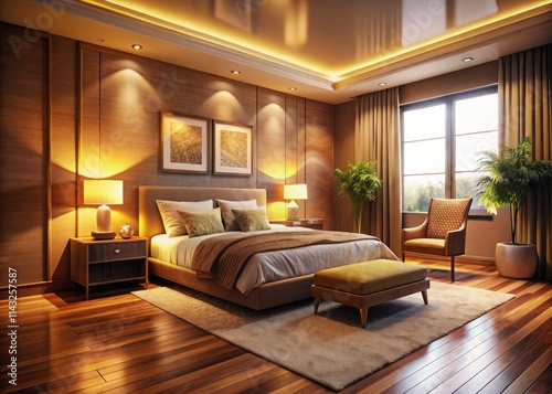 Stylish bedroom interior, beautifully illuminated, showcasing warm lighting and elegant home décor.