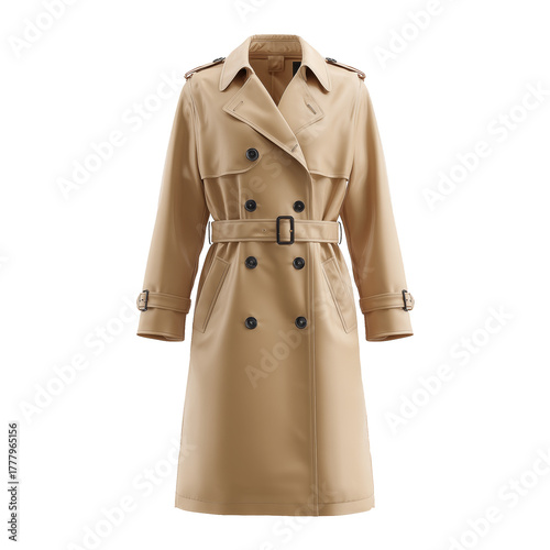Stylish Beige Trench Coat With Belt Displayed Against a White Background Ideal for Any Season