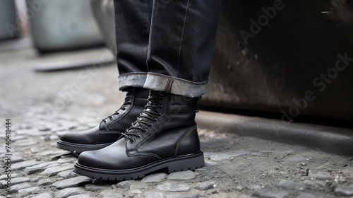 Stylish Black Combat Boots on Cobblestone Street, Edgy Footwear Fashion