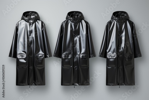 Stylish black raincoat mockup displaying multiple angles and features for protective fashion
