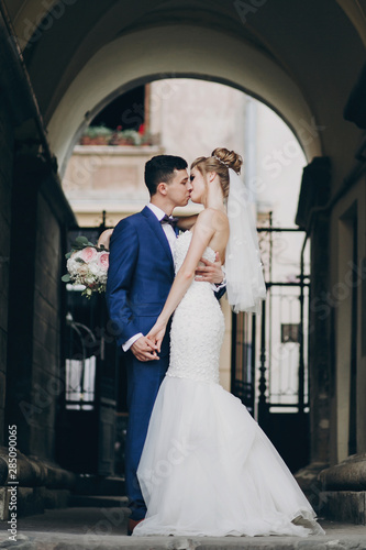 Stylish bride and groom gently kissing in sunny european city street. Gorgeous wedding couple of newlyweds embracing in old buildings. Romantic moment