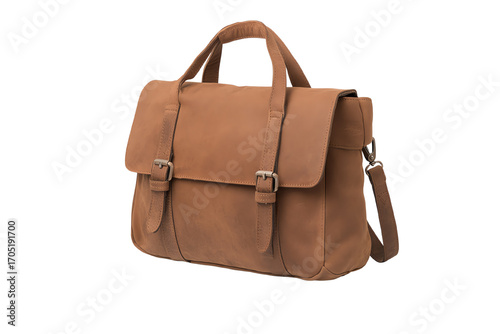 Stylish brown leather briefcase with handle and adjustable strap on a white isolated background.