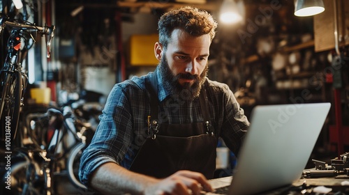 businessman, stylish, bearded, bicycle, laptop, workshop, tool, sharpened, design, creativity, industry, workspace, male, professional, modern, craftsmanship, repair, technology, innovation, strategy, planning, concentration, concept, artisan, service, management, equipment, mechanical, work, office, environment, productivity, casual attire, dressed, working, client, client, hand, shop, maintenance, task, detail, project, bike, computer, skill