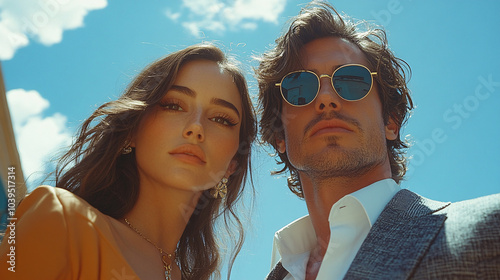 Stylish couple against a bright sky, both wearing sunglasses and modern fashion, their confident expressions exude sophistication and glamour against the clear, sunny day
