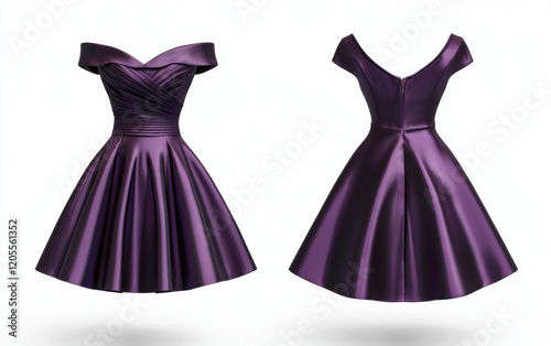 Stylish dark purple cocktail dress mockup, front and back view, 3D rendering, white background