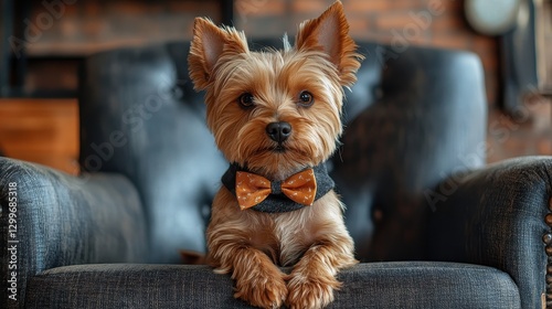 Stylish dog in bowtie cozy living room pet photography warm environment close-up view charm and elegance
