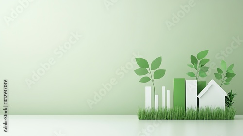 Stylish eco-friendly representation of a home with green leaves and growth bars, symbolizing sustainability and nature.