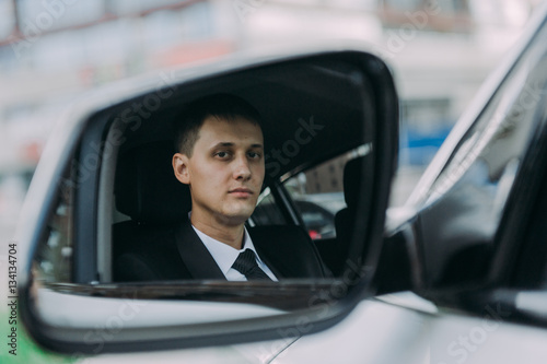 stylish elegant groom holding bouquet standing near car on the background of old city
