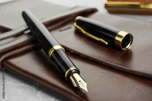 Stylish fountain pen, cap and leather notebook on light grey table, closeup