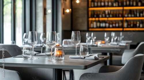 Stylish grey dining area with grey chairs, grey table settings, and warm lighting.