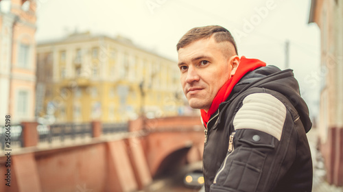 Stylish handsome young man. A young man in a black jacket walks through the old town. Stylishly dressed young man on the street. The guy in the center of the city. Travel to a European city.