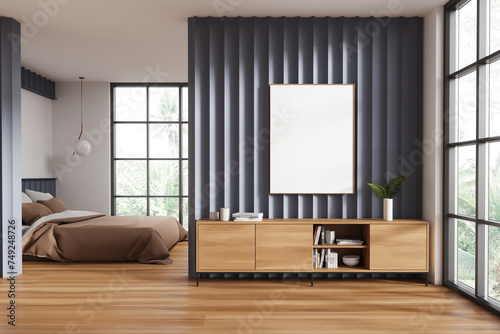 Stylish hotel bedroom interior with bed and drawer near window. Mock up frame