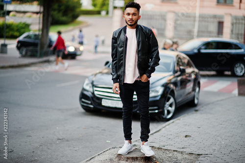 Stylish indian beard man at black leather jacket against car. India model posed at streets of city.