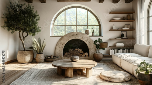 Stylish living room interior with an arched window, fireplace, and modern furnishings.