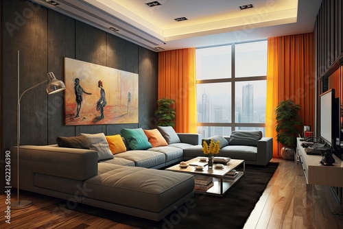 living, room, modern, interior, design, orange, brown, window, city, view, fashion, grey, luxury, cosy, couch, trendy, elegant, estate, stylish, house, style, indoor, architecture, frontal, hall, vase, armchair, decor, table, chandelier, hallway, lamp, antechamber, seat, contemporary, carpet, plant, pillow, front, furniture, decoration, sofa, lounge, comfortable, render, home, wall, apartment
