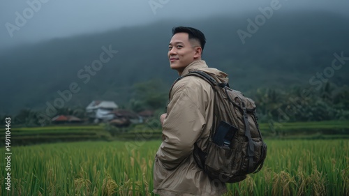 man, traveler, hiking, backpack, rice, field, greenery, nature, wet, rain, outdoors, landscape, exploration, adventure, fog, climate, travel, lifestyle, smiling, clothing, beige, photo, scenic, peaceful, serene, portrait, horizon, scenery, back, casual attire, joy, fresh, migration, rural, wonder, freedom, atmosphere, wanderlust, culture, environment, landmark, view, background, mood, remote, area, connectivity, water
