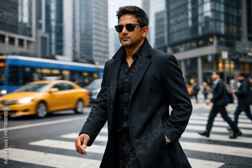 man, city, street, fashion, style, urban, business, professional, walking, crosswalk, sunglasses, coat, black, taxi, yellow, bus, transportation, traffic, pedestrian, downtown, modern, sophisticated, confident, leader, successful, commute, lifestyle, new york city, new york city, new york city, building, architecture, daylight, people, blurred background, motion, dynamic, sharpened, foreground, outerwear, clothing, male, sidewalk, season, autumn, winter