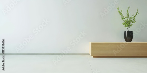 Stylish minimalist interior design featuring a plant and wooden furniture