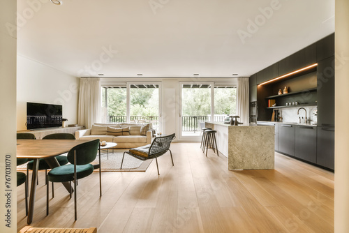 interior, design, living room, kitchen, modern, roomy, chic, stylish, high-end, finish, natural light, balcony, door, contemporary, furniture, sofa, table, chair, television, cabinet, floor, wood, elegant, decor, architecture, home, apartment, luxury, comfortable, minimalist, trendy, marble, island, lighting, urban, cosy, residential, indoor, window, curtain, plant, elegance, sophistication, real estate
