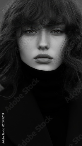 woman, portrait, monochrome, black-and-white, model, female, fashion, beauty, style, hair, curly hair, long hair, turtleneck, sweater, clothing, attire, elegant, sophisticated, serious, intense, gaze, eye, face, closeup, head shot, expression, emotion, moody, dramatic, dark, mysterious, contemporary, chic, glamour