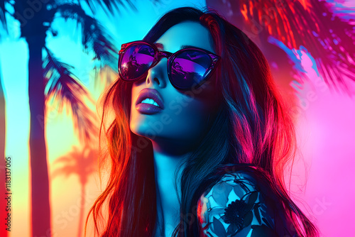 Stylish Neon Woman with Sunglasses in a Vibrant Tropical Palm Tree Sunset Background – Perfect for Creative Summer, Fashion, and Beach-Themed Visuals