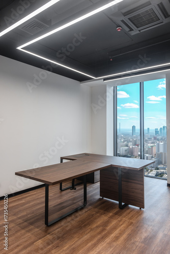 Stylish office interior with wooden desk and panoramic window. Modern corporate workspace with desk partitions and city view