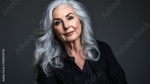 stylish, older, woman, full, head, silver, hair, posing, confidently, studio, monochromatic, look, elegance, mature, portrait, confident, pose, style, ageing, bold, statement, timeless, beauty, sophisticated, grey, trend