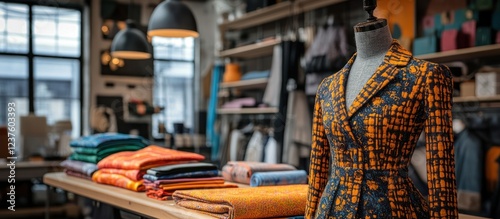 Stylish orange and black patterned jacket displayed on a mannequin in a clothing boutique, surrounded by stacks of colorful fabrics.