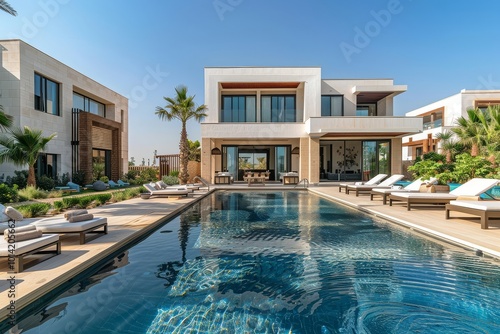 pool, area, modern, architecture, clear sky, plant, sandy, beige, luxurious, house, photo, design, luxury, relaxation, environment, sunny, summer, resort, elegance, vibrant, aesthetic, setting, beautiful, residential, atmosphere, calmness, landscape, contemporary, upscale, swimming, leisure