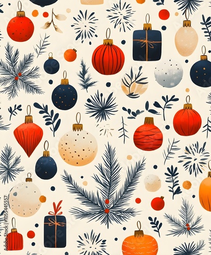 Stylish pattern of Christmas motifs, such as Christmas tree balls and gifts, in warm colors