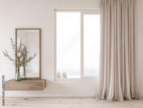 Stylish property interiors composition with a mirror next to a large window filling the room with natural lighting. Residential interiors design with minimal decor and warm colors.