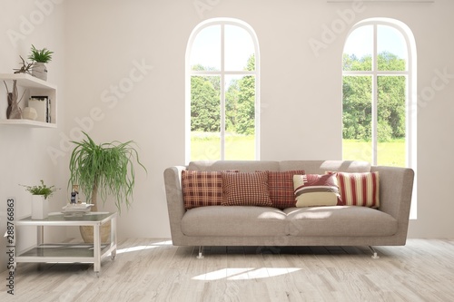Stylish room in white color with sofa and summer landscape in window. Scandinavian interior design. 3D illustration